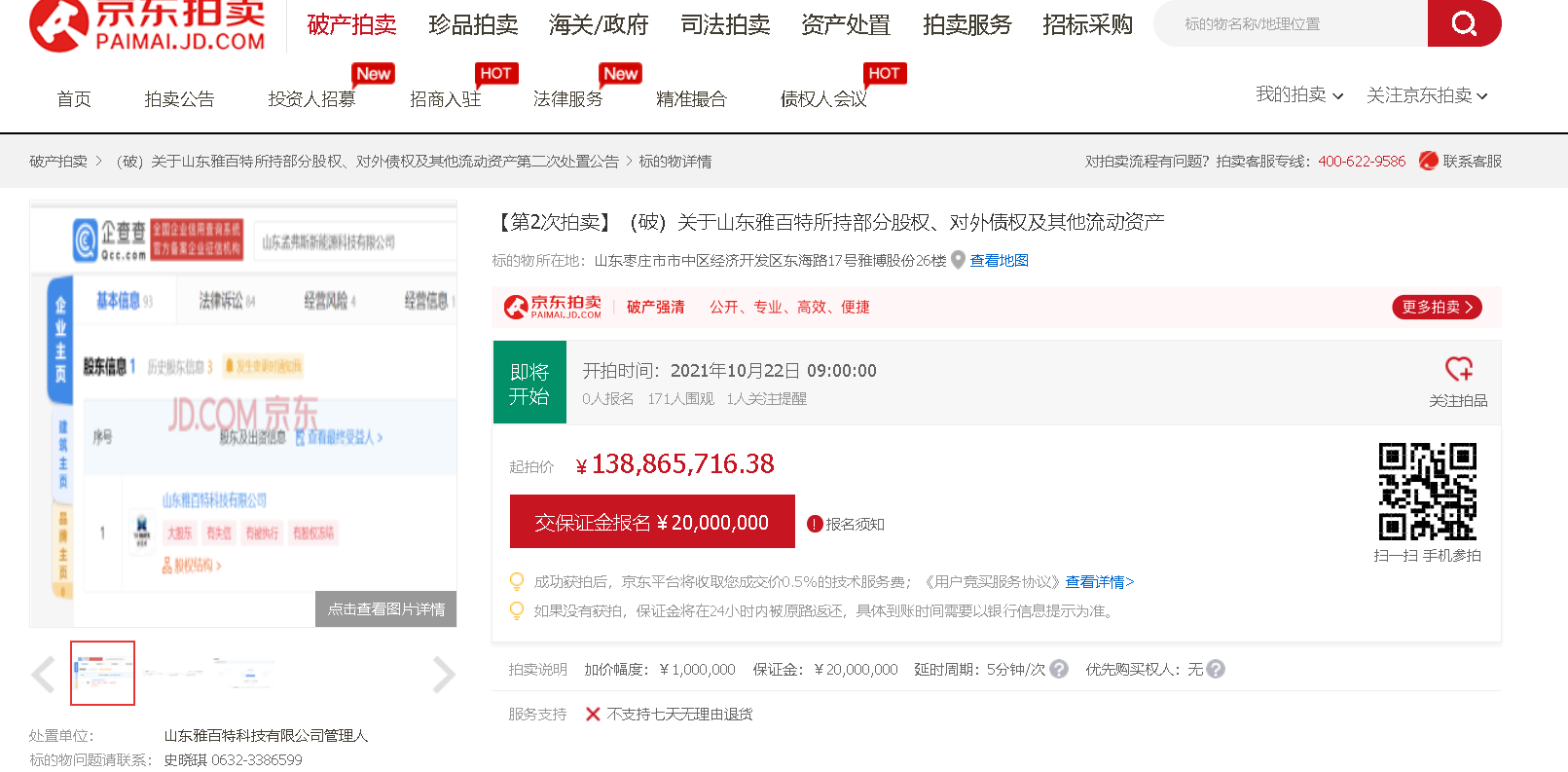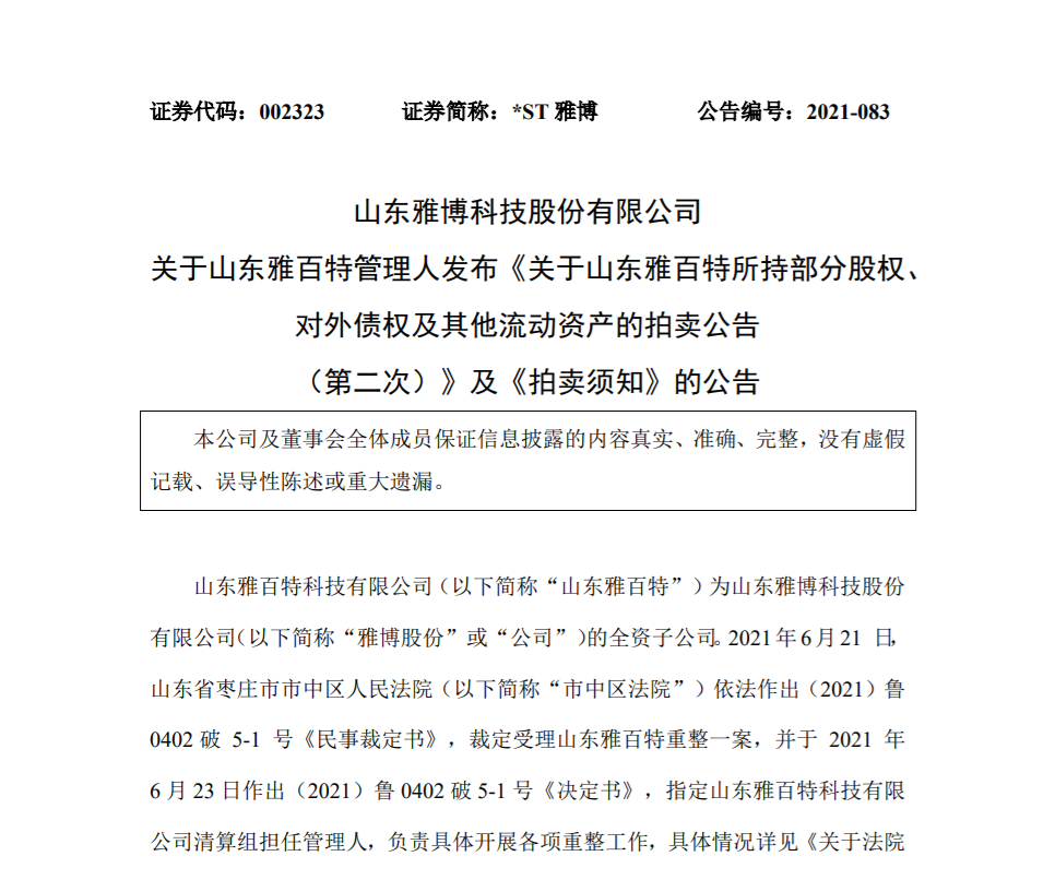 公告显示,6月21日,山东省枣庄市市中区人民法院依法裁定受理山东雅百特破产重整一案,并于6月23日指定山东雅百特清算组担任管理人,具体开展重整各项工作。9月27日山东雅百特在“京东拍卖破产强清平台”发布了第一次拍卖通知,于10月13日9时至10月14日时止(延时的除外)在拍卖平台对公司所持部分股权、对外债权及其他流动资产进行公开拍卖。