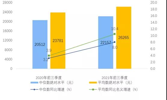 前三季度,全国居民人均可支配收入26265元,同比名义增长10.4%,两年平均增长7.1%;扣除价格因素同比实际增长9.7%,两年平均增长5.1%,与经济增长基本同步。