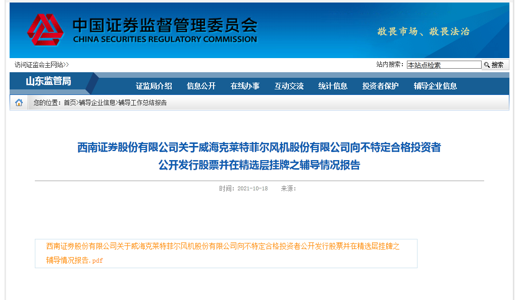 18日,据中国证券监督管理委员会山东监管局(以下简称“山东监管局”)消息,西南证券股份有限公司发布关于威海克莱特菲尔风机股份有限公司(克莱特.831689.OC)向不特定合格投资者公开发行股票并在精选层挂牌之辅导情况报告,辅导结束意味着克莱特距在精选层挂牌又进一步。