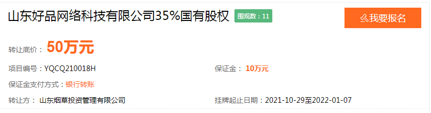 今日,中国烟草总公司山东省公司(简称“中烟山东”)旗下的山东烟草投资管理有限公司,第二次将所持山东好品网络科技有限公司(简称“好品科技”)35%股权公开转让,底价仍为50万,挂牌期截至2022年1月7日。山东烟草投资管理有限公司工作人员(下称“工作人员”)向鲁网·泰山财经记者透露,首次挂牌因时间到期而撤牌,转让原因系好品科技持续亏损。