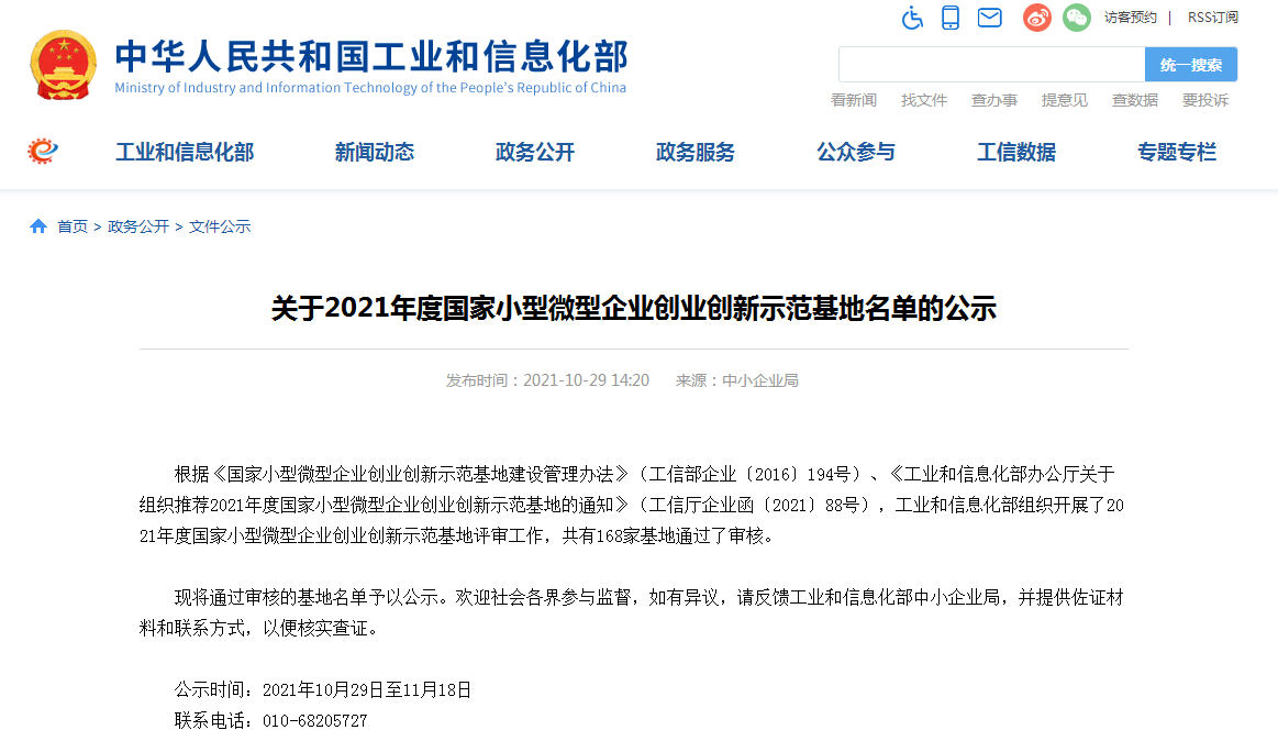 公告显示,根据《国家小型微型企业创业创新示范基地建设管理办法》(工信部企业〔2016〕194号)、《工业和信息化部办公厅关于组织推荐2021年度国家小型微型企业创业创新示范基地的通知》(工信厅企业函〔2021〕88号),工业和信息化部组织开展了2021年度国家小型微型企业创业创新示范基地评审工作。