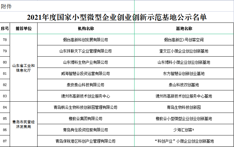 山东省共10家入选,分别是烟台高新区1号创客空间、奎文区小微企业创业创新基地、山东博科小微企业创业创新基地、东方智慧谷创新创业基地、泰山科技双创基地、德州市高新技术创业服务中心基地,青岛生物科技创新园、橡胶谷小型微型企业创业创新基地、少海汇创客+、“科创产业”小微企业创业创新基地。
