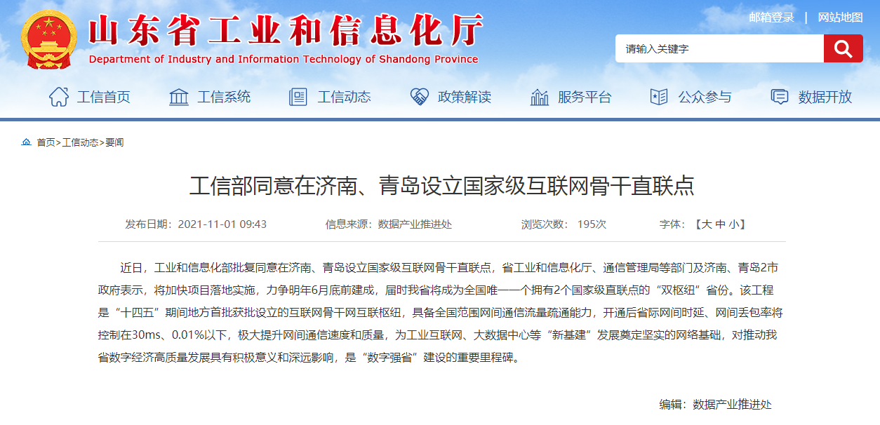 鲁网·泰山财经记者从山东省工业和信息化厅获悉,近日,工业和信息化部批复同意在济南、青岛设立国家级互联网骨干直联点,省工业和信息化厅、通信管理局等部门及济南、青岛2市政府表示,将加快项目落地实施,力争明年6月底前建成,届时山东将成为全国唯一一个拥有2个国家级直联点的“双枢纽”省份。
