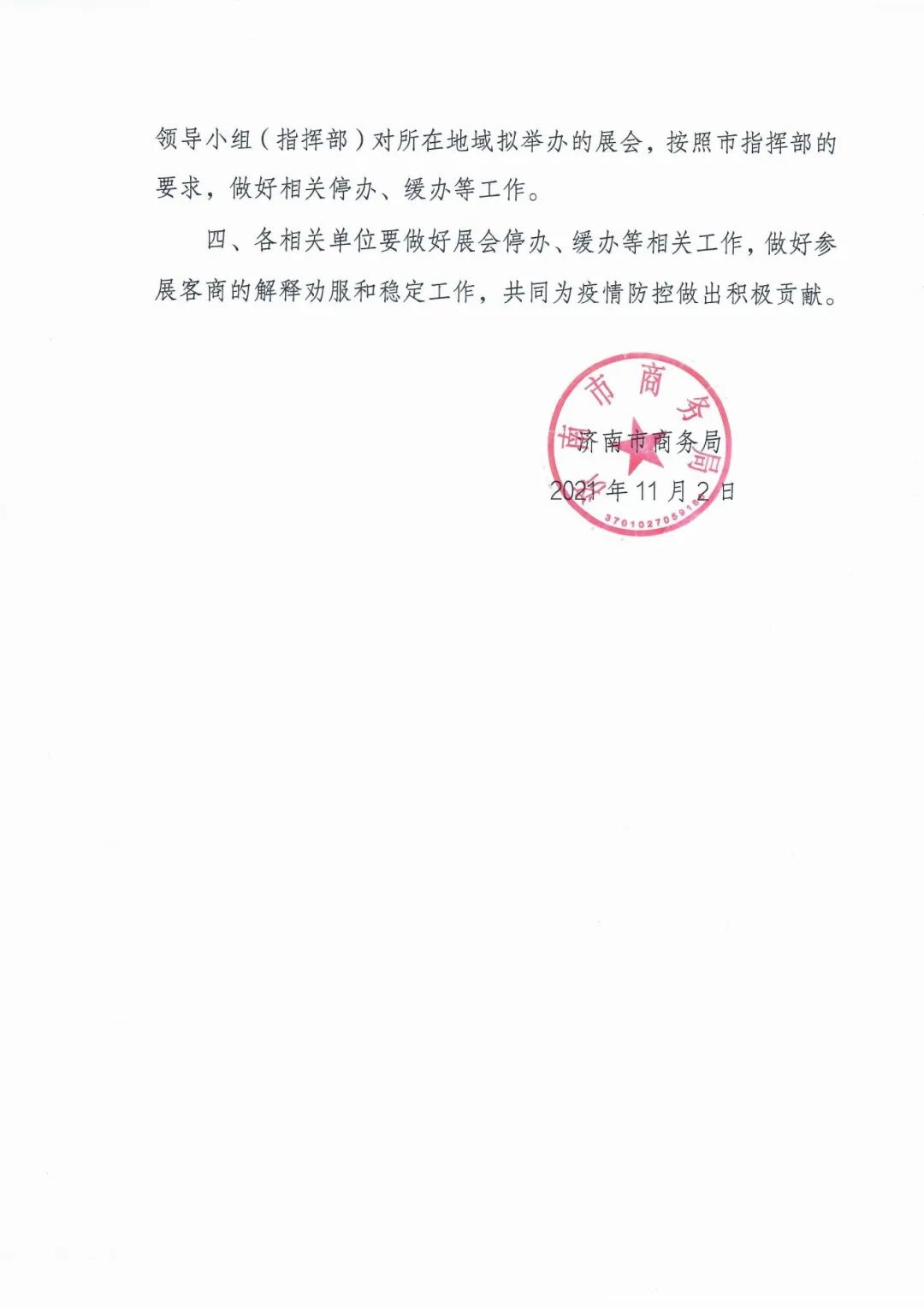 11月2日,济南市商务局发布暂停缓办展会活动的通知。