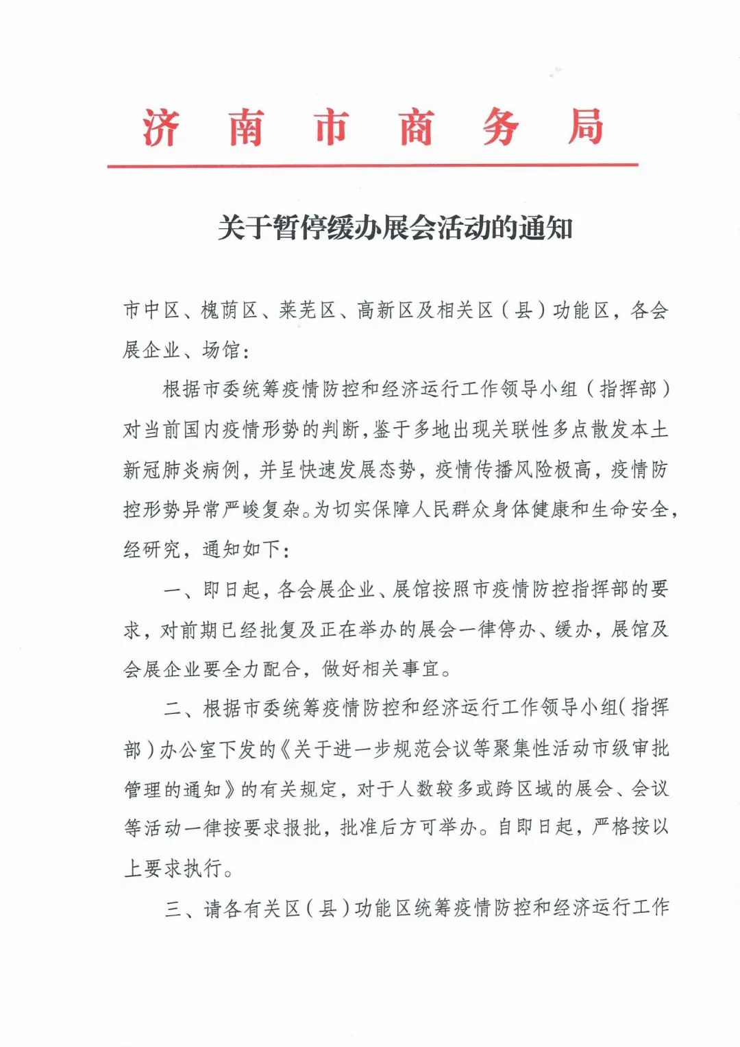 济南市商务局表示,根据市委统筹疫情防控和经济运行工作领导小组(指挥部)对当前国内疫情形势的判断,鉴于多地出现关联性多点散发本土新冠肺炎病例,并呈快速发展态势,疫情传播风险极高,疫情防控形势异常严峻复杂。为切实保障人民群众身体健康和生命安全,经研究决定从即日起,各会展企业、展馆按照市疫情防控指挥部的要求,对前期已经批复及正在举办的展会一律停办、缓办,展馆及会展企业要全力配合,做好相关事宜。