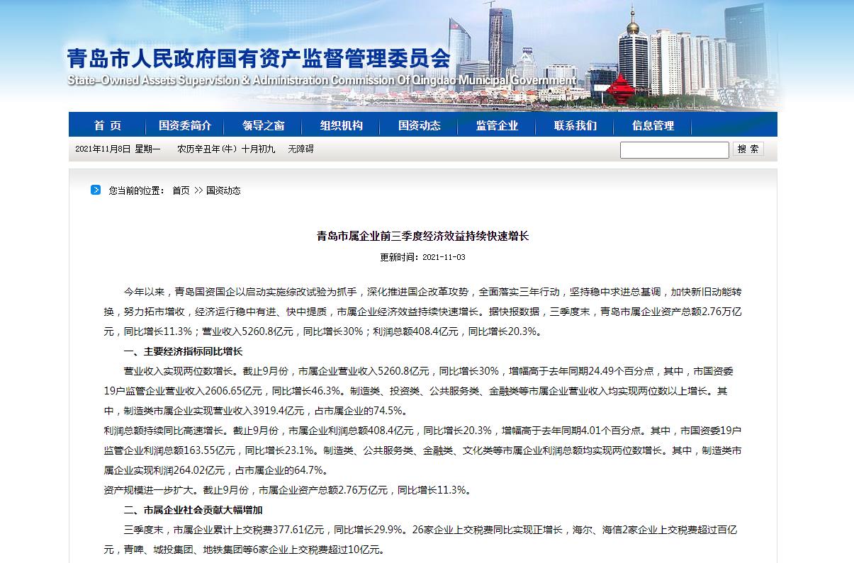 近日,青岛市国资委官网发布《青岛市属企业前三季度经济效益持续快速增长》一文,披露三季度末,青岛市属企业资产总额2.76万亿元,同比增长11.3%;营业收入5260.8亿元,同比增长30%;利润总额408.4亿元,同比增长20.3%。此外,海尔、海信2家企业上交税费超过百亿元。