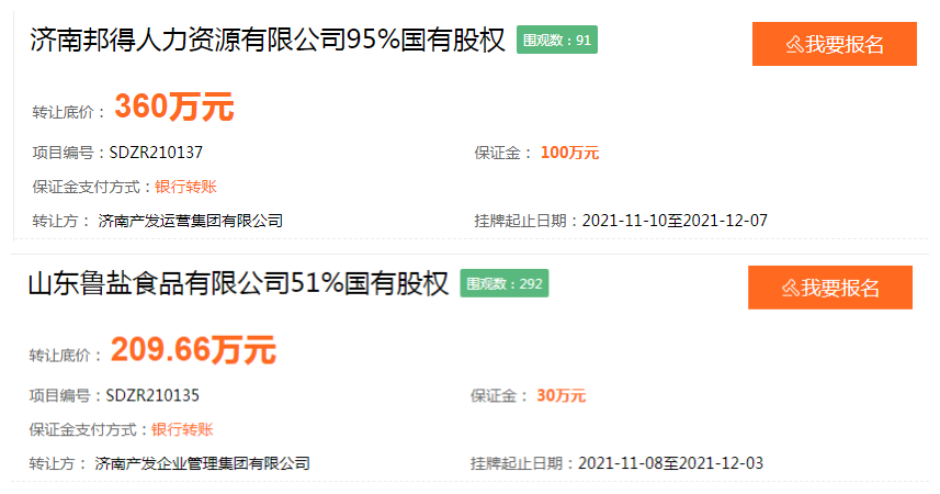 11月8日,济南产发集团旗下济南产发企业管理集团有限公司(简称“济南产发企管集团”)公告称,拟转让鲁盐食品51%国有股权,底价209.66万元,挂牌期截至12月3日。2天后,济南产发运营集团有限公司(简称“济南产发运营集团”)也将转让济南邦得人力资源公司95%股权予以披露,底价为360万,挂牌期截至12月7日。