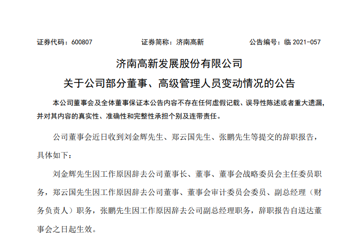 济南高新发展股份有限公司(济南高新.600807.SH)11月11日晚公告,公司董事会近日收到刘金辉、郑云国、张鹏等提交的辞职报告。刘金辉因工作原因辞去公司董事长、董事、董事会战略委员会主任委员职务,郑云国因工作原因辞去公司董事、董事会审计委员会委员、副总经理(财务负责人)职务,张鹏因工作原因辞去公司副总经理职务,辞职报告自送达董事会之日起生效。