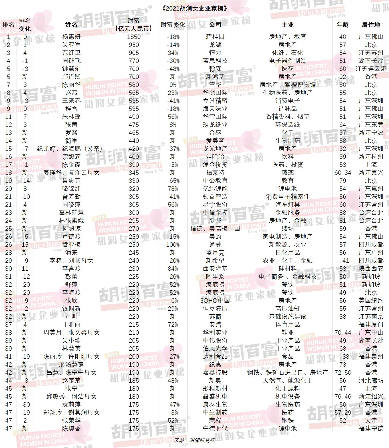 12日,胡润研究院发布《2021胡润女企业家榜》,列出了今年胡润百富榜上前50名女企业家。碧桂园杨惠妍以1850亿元第九次成为中国女首富,龙湖吴亚军以950亿元重新成为中国白手起家女首富,化纤制造商恒力的范红卫以905亿元首次进入前三,华熙国际赵燕以565亿元首次进入前十,格力董明珠因财富未达到门槛而未上榜。