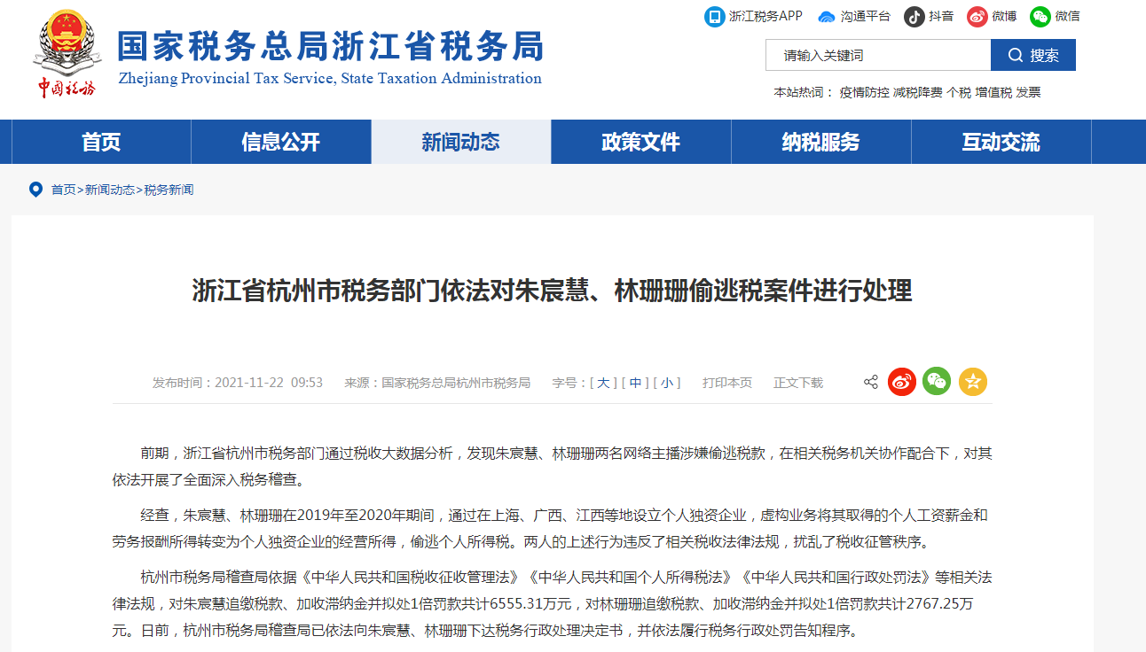 国家税务总局杭州市税务局表示,前期,浙江省杭州市税务部门通过税收大数据分析,发现朱宸慧、林珊珊两名网络主播涉嫌偷逃税款,在相关税务机关协作配合下,对其依法开展了全面深入税务稽查。