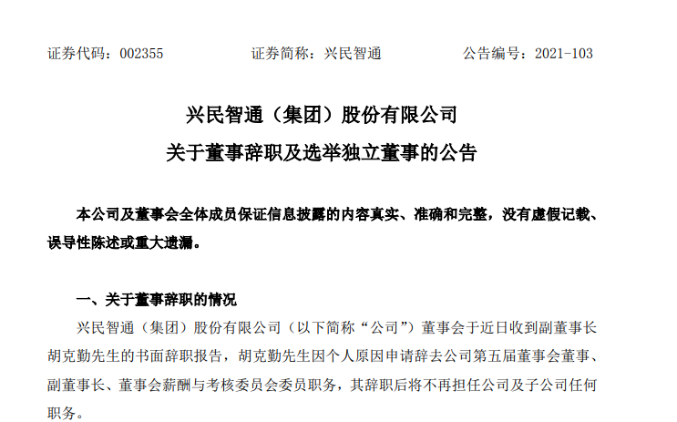 兴民智通董事会于近日收到副董事长胡克勤的书面辞职报告,胡克勤因个人原因申请辞去公司第五届董事会董事、副董事长、董事会薪酬与考核委员会委员职务,其辞职后将不再担任公司及子公司任何职务。根据《公司法》《公司章程》等规定,胡克勤的辞职不会导致公司董事会成员人数低于法定最低人数,不会影响公司董事会正常运作,其辞职报告自送达董事会之日起生效。