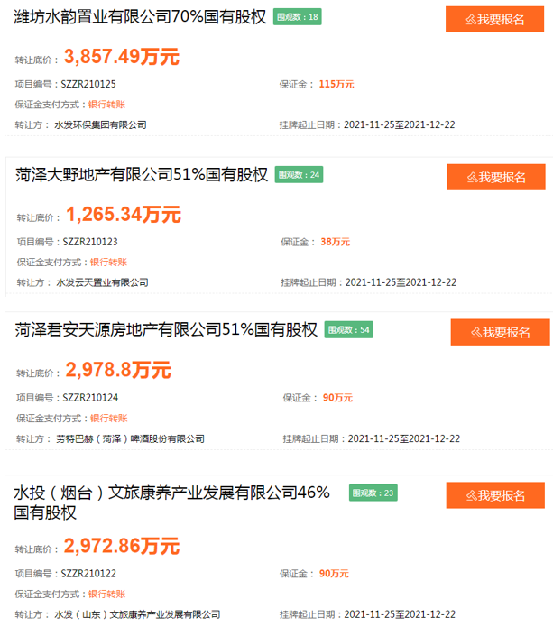 今日,山东产权交易中心披露,水发集团旗下4家位于烟台、菏泽、潍坊的房地产企业被“打包”转让,总底价为1.11亿元,挂牌时间均截至12月22日。