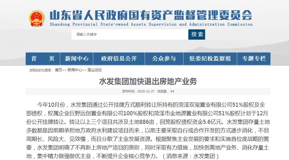 去年11月,山东省国资委官方网站国企动态栏目披露,水发集团加快退出房地产业务。水发集团存量土地多数都是因前期承担地方政府水利建设项目而来,以前主要采取自行或合作开发的方式逐步消化,不但周期长、风险大、见效慢,而且分散了主业发展资源。
