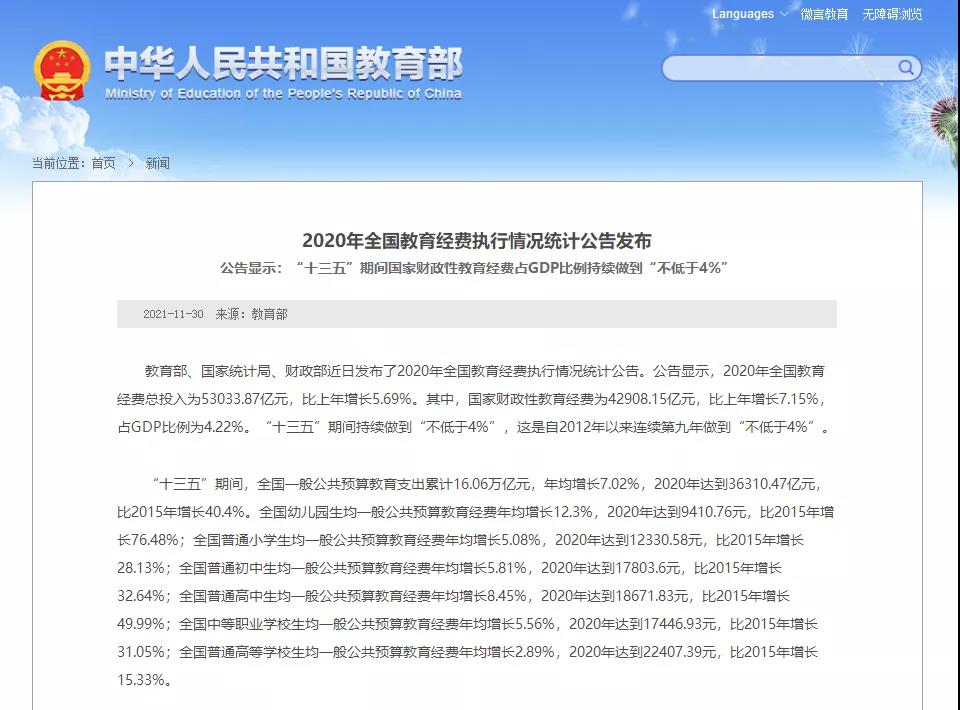 记者11月30日从教育部网站了解到,2020年全国教育经费总投入为53033.87亿元,比上年增长5.69%。其中,国家财政性教育经费为42908.15亿元,比上年增长7.15%,占GDP比例为4.22%。这是自2012年以来连续第九年做到“不低于4%”。