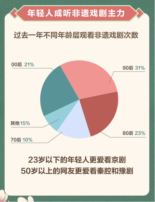 报告显示,90后、00后已经成为抖音听非遗戏剧的主力,占总观众的52%。70后观众仅占10%。其中,河南网友观看非遗戏剧52.31亿次,成过去一年最爱听戏的网友群体。广西网友和云南网友观看量增长208%,成过去一年听戏兴趣增长最快的网友群体。