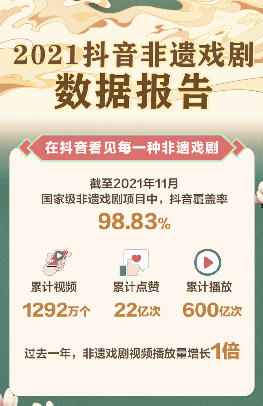 12月1日,抖音发布《2021抖音非遗戏剧数据报告》(以下称“报告”)。报告显示,截至2021年11月,抖音实现覆盖98.83%国家级非遗戏剧项目,非遗戏剧视频累计播放600亿次,累计获赞22亿次。抖音成为网友观看非遗戏剧、学习戏剧知识的重要平台。