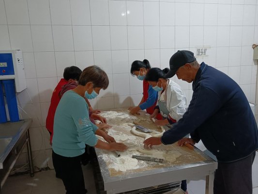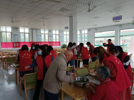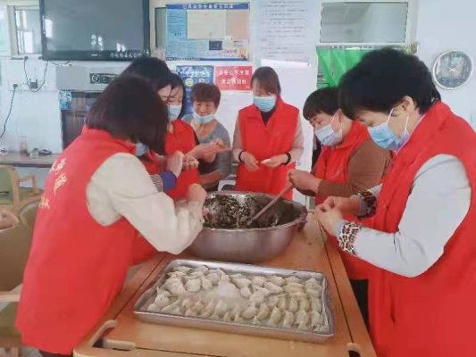 在街道敬老院餐厅里,志愿者们和老人们一起包饺子。大家一起拌馅、包捏,和老人们边包边聊,欢声笑语,其乐融融,现场气氛热闹非凡。
