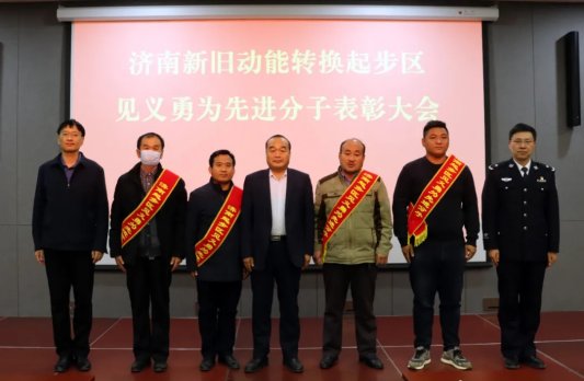 近日,济南市新旧动能转换起步区举行2021年“见义勇为先进分子”授奖仪式,对贾明永等4名有突出表现的见义勇为个人进行了表彰,济南市新旧动能转换起步区管委会主任助理、社会事业部部长秦光强向受到表彰的4位同志颁发了荣誉证书和奖金。见义勇为先进分子代表贾明永、周峰同志讲述了自己的见义勇为事迹。