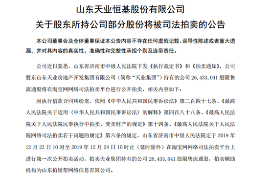 记者了解到,因执行借款合同纠纷案,山东省济南市中级人民法院定于2019年12月23日至2019年12月24日在淘宝网网络司法拍卖平台上进行第一次公开拍卖活动,拍卖天业集团持有的公司2643.30万股限售流通股,拍卖辅助机构为山东拍辅帮网络信息有限公司。