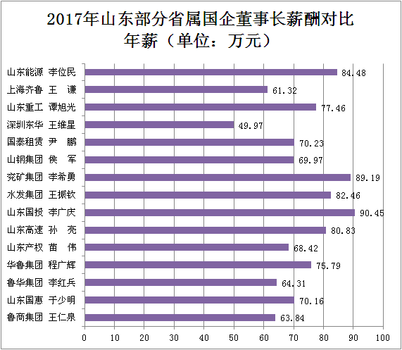 此外,位于2017年薪酬70万元与80万元梯度的国企董事长数量一样多,都是4位,他们分别是山东国惠(于少明:70.16万元)、华鲁集团(程广辉:75.79万元)、国泰租赁 (尹鹏:70.23万元)、山东重工(谭旭光:77.46万元)、山东高速(孙亮:80.83万元)、水发集团(王振钦:82.46万元)、兖矿集团(李希勇:89.19万元)、山东能源(李位民:84.48万元)。