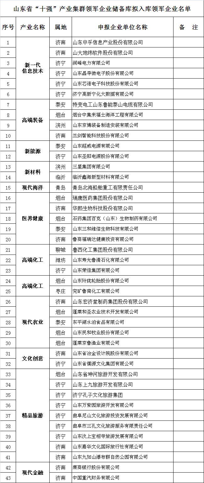 据资料显示,海尔集团公司、浪潮集团有限公司、鲁南制药集团股份有限公司等企业上榜“山东省‘十强’产业集群领军企业库拟入库领军企业名单。