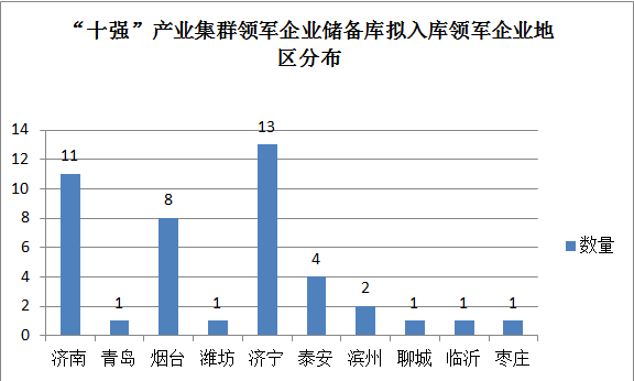 记者据图了解到,上榜山东省“十强”产业集群领军企业储备库拟入库领军企业名单中,济宁最多有13家上榜,以精品旅游行业为主的企业最多;其次是济南有11家上榜企业,以新一代信息技术和医养健康等行业为主的企业最多;烟台有8家企业上榜,以现代农业为主的企业最多;泰安有4家上榜企业;滨州有2家上榜企业;此外,青岛、潍坊、聊城、临沂和枣庄上榜名单只有1家。