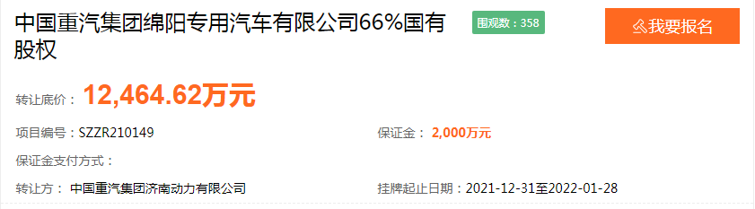鲁网·泰山财经1月4日讯(记者 吴奕萱)山东产权交易中心于近日披露,中国重汽集团济南动力有限公司拟以1.25亿元底价,转让中国重汽集团绵阳专用汽车有限公司(简称“中国重汽绵专”)66%国有股权,挂牌期截至1月28日。企查查显示,中国重汽集团济南动力有限公司在四川控股企业共4家,其中绵阳仅中国重汽绵专一家企业。