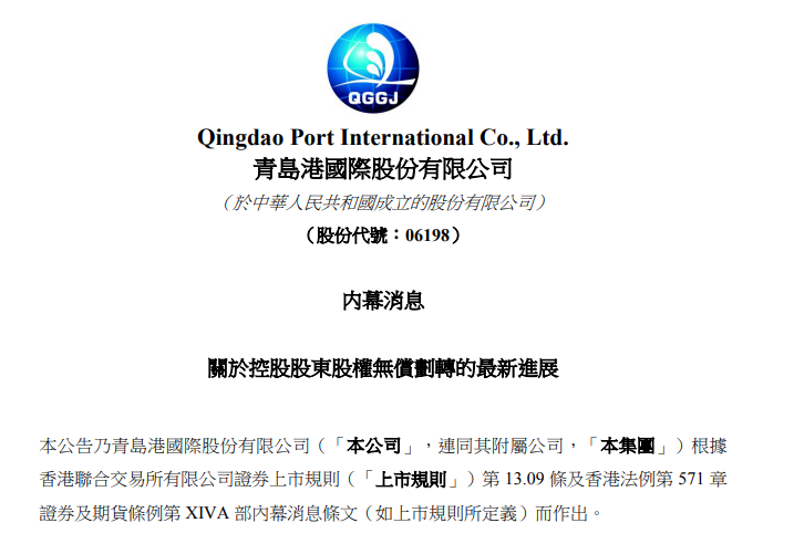 1月23日,青岛港国际股份有限公司(06198.HK)发布公告称,1 月 23 日,青岛港收到山东港口青岛港集团有限公司通知,表示山东省港口集团、青岛市国资委、山东港口青岛港集团有限公司签订了《山东省港口集团有限公司与青岛市人民政府国有资产监督管理委员会关于山东港口青岛港集团有限公司51%股权之无偿划转协议》,据此,青岛市国资委将向山东省港口集团无偿转让青岛港集团51%股权。