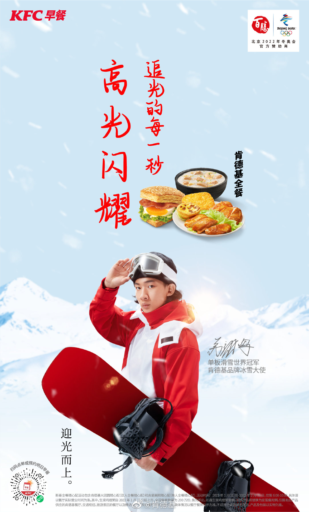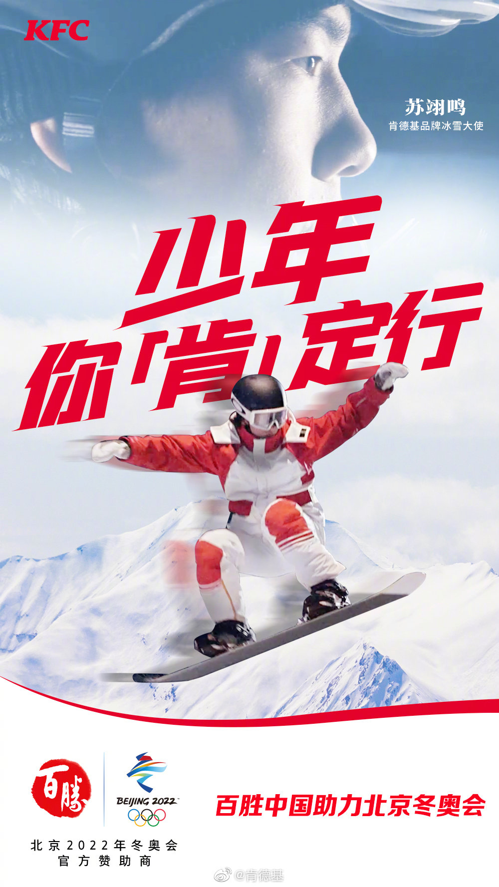 中国冬奥历史上短道速滑首位男子冠军、短道速滑男子500米世界纪录保持者及奥运会纪录保持者武大靖2020年起便担任肯德基品牌代言人。而刚刚获得北京冬奥会单板滑雪男子坡面障碍技巧银牌的苏翊鸣,更是肯德基品牌冰雪大使。在出征冬奥之际,武大靖与苏翊鸣一同亮相肯德基广告,以坚定沉稳的步伐向风雪中的赛场走去,迎接属于他们的新挑战,展现“开始的力量”。