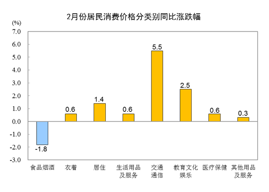 2月份,食品烟酒类价格同比下降1.8%,影响CPI(居民消费价格指数)下降约0.54个百分点。食品中,畜肉类价格下降26.0%,影响CPI下降约1.11个百分点,其中猪肉价格下降42.5%,影响CPI下降约0.95个百分点;鲜果价格上涨6.6%,影响CPI上涨约0.13个百分点;水产品价格上涨4.9%,影响CPI上涨约0.10个百分点;蛋类价格上涨2.6%,影响CPI上涨约0.02个百分点;粮食价格上涨1.5%,影响CPI上涨约0.03个百分点。