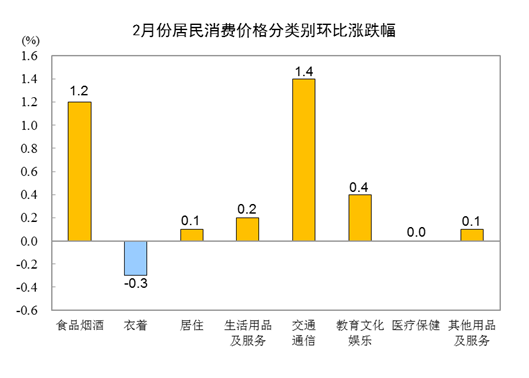2月份,全国居民消费价格环比上涨0.6%。其中,城市上涨0.6%,农村上涨0.6%;食品价格上涨1.4%,非食品价格上涨0.4%;消费品价格上涨1.0%,服务价格持平。