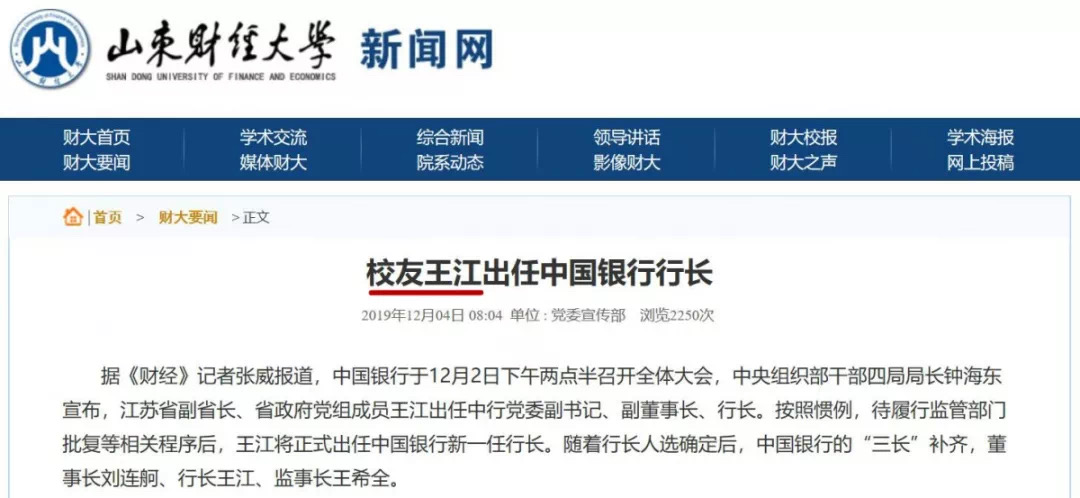12月2日,《财经》杂志发布消息称,中国银行召开全体大会,会上宣布了江苏省副省长、省政府党组成员王江将出任中行党委副书记、副董事长、行长。据悉,王江大学期间于山东经济学院财金系金融专业学习毕业后留校任教。