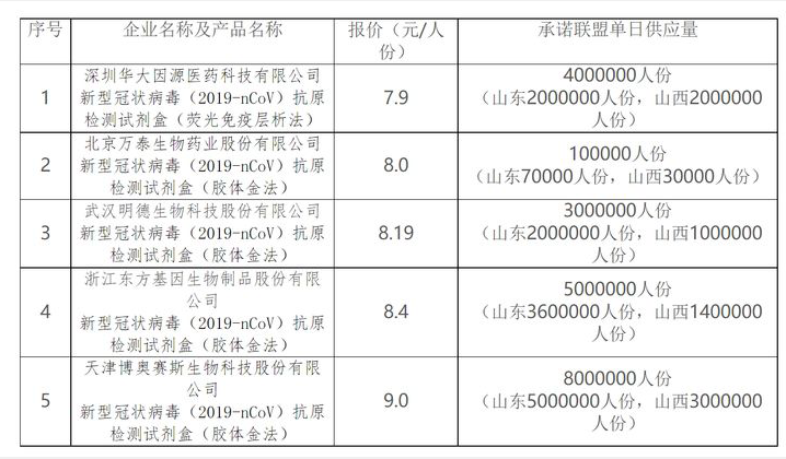 我省要求,中选企业必须保证中选试剂产品及时、足量、保质供应。据了解,中选企业深圳华大因源医药科技有限公司生产的荧光免疫层析法试剂盒报价7.9元/人份,也是本次中选的最低价,承诺山东单日供应量200万人份;天津博奥赛斯生物科技股份有限公司生产的胶体金法试剂盒报价9.0元/人份,承诺山东单日供应量500万人份。