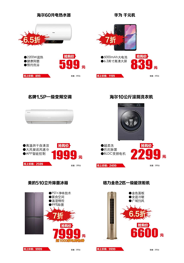 除上述活动政策外,消费者还可享受30元团300元开业礼包券,其中手机、数码、电脑满2000以上使用100元,彩电、冰箱、洗衣机、空调、厨房电器、卫浴电器、小家电等传统家电1500以上使用100元,3000以上用200元,普惠让利泉城市民。