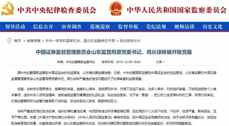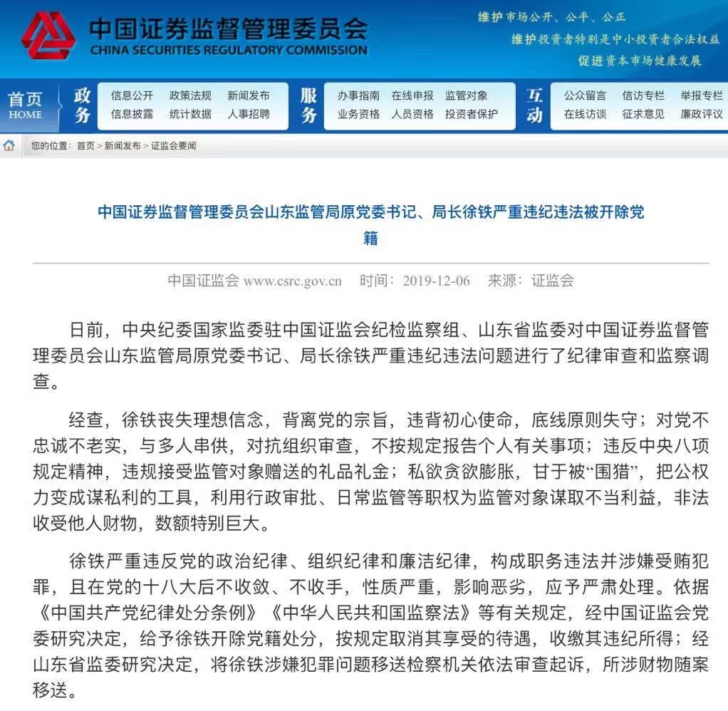 12月6日,中央纪委国家监委与中国证监会共同发布消息称,中国证券监督管理委员会山东监管局原党委书记、局长徐铁因严重违纪违法问题被开除党籍。据悉,徐铁于2013年10月到龄退休,2019年6月14日,因涉嫌严重违纪违法,接受纪律审查和监察调查,系山东济南人。