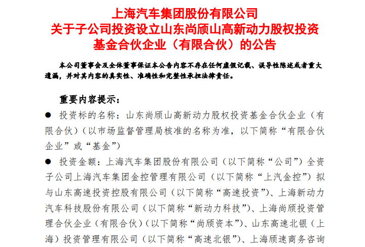 上汽集团(600104.SH)5月30日披露,公司全资子公司上海汽车集团金控管理有限公司(下称“上汽金控”)拟与山东高速集团全资子公司山东高速投资控股有限公司(下称“山高投资”)等,共同出资设立山东尚颀山高新动力股权投资基金合伙企业(有限合伙)。