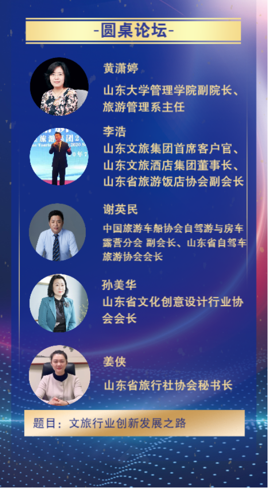 在专题交流与圆桌论坛环节,将邀请山东省新旧动能转换重大工程精品旅游产业智库副秘书长孙平、山东省自驾车旅游协会会长谢英民、山东省文化创意设计行业协会会长孙美华、山东省旅行社协会秘书长姜侠,展开专题交流,围绕“文旅行业创新发展之路”进行智慧碰撞。