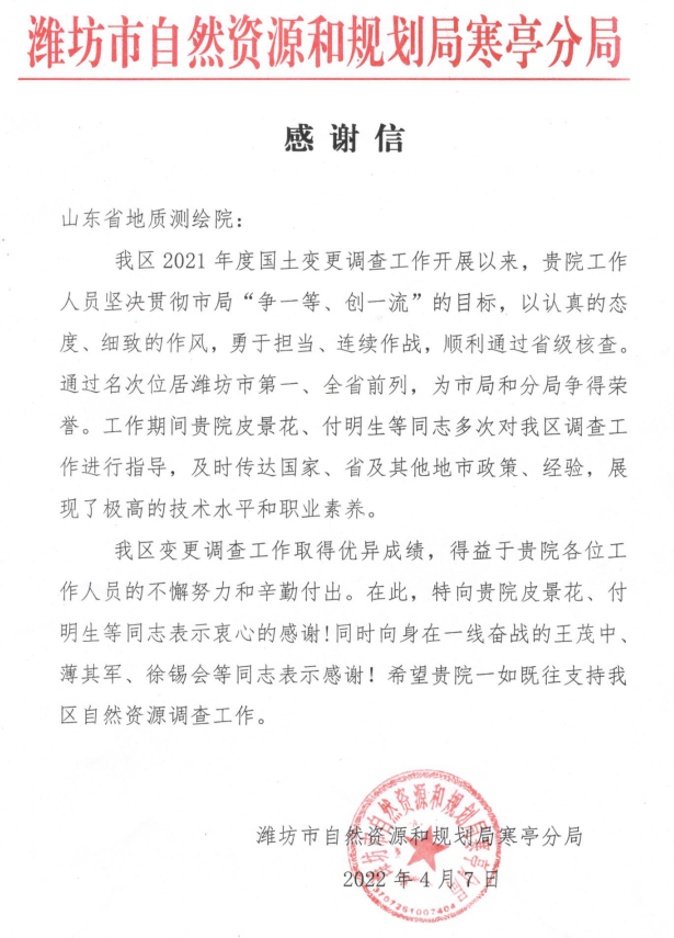 近日,省地质测绘院收到潍坊市自然资源和规划局寒亭分局发来的感谢信,对地质测绘院在2021年度国土变更调查工作中提供的技术支持表示感谢。