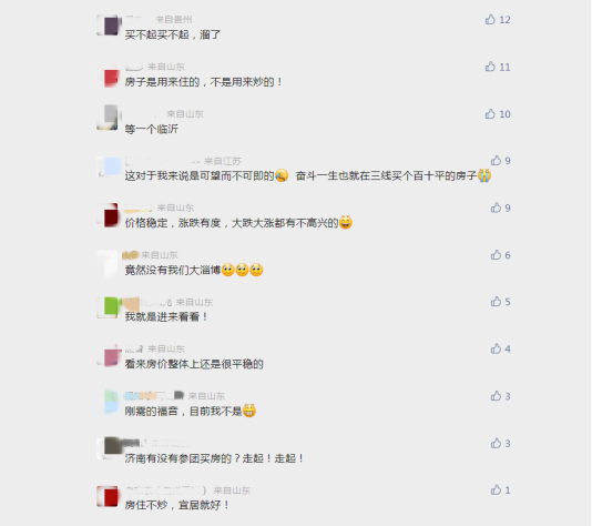 就济南情况,从2022年1月开始,济南新房价格环比持续上涨,连涨3个月后,4月环比下跌0.2%,5月环比上涨0.5%,6月环比上涨0.3%。二手房方面,从2021年9月开始环比持续下跌,截至目前已连跌10个月,2022年6月环比下跌0.1%。网友针对统计情况引发热议,有网友表示:“济南有没有参团买房的?走起!走起!”“买不起,买不起,溜了。”“价格稳定,涨跌有毒,大跌大涨都有不高兴的。”