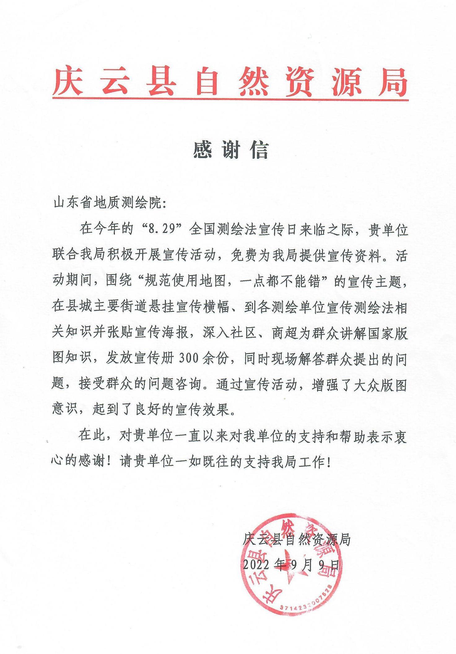 近日,省地质测绘院收到庆云县自然资源局感谢信,对省地质测绘院在“8.29”全国测绘法宣传日宣传活动中提供的支持表示感谢。