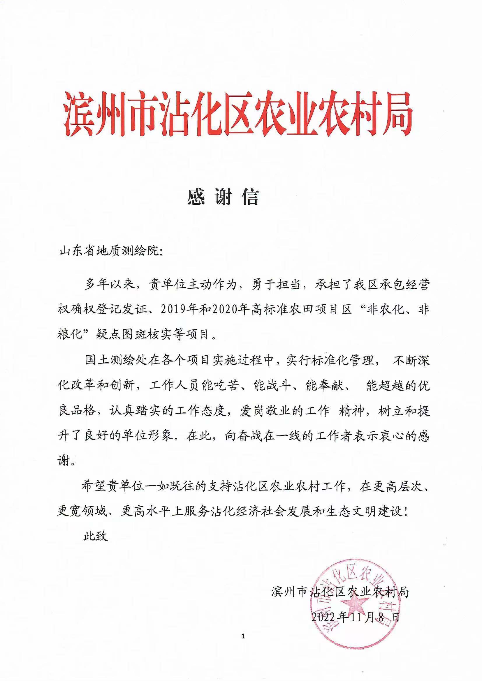 鲁网11月16日讯 近日,省地质测绘院收到滨州市沾化区农业农村局感谢信,对省地质测绘院承担完成的承包经营权确权发证、2019年和2020年高标准农田项目区“非农化、非粮化”疑点图斑核实等项目给予高度评价,并向奋战在一线的工作者表示衷心的感谢。