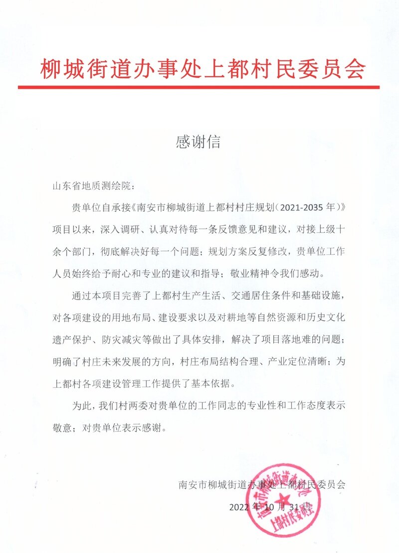 鲁网11月16日讯 近日,省地质测绘院收到南安市柳城街道办事处上都村民委员会感谢信,对省地质测绘院编制的《南安市柳城街道上都村村庄规划(2021-2035 年)》项目提供的专业支持表示感谢。