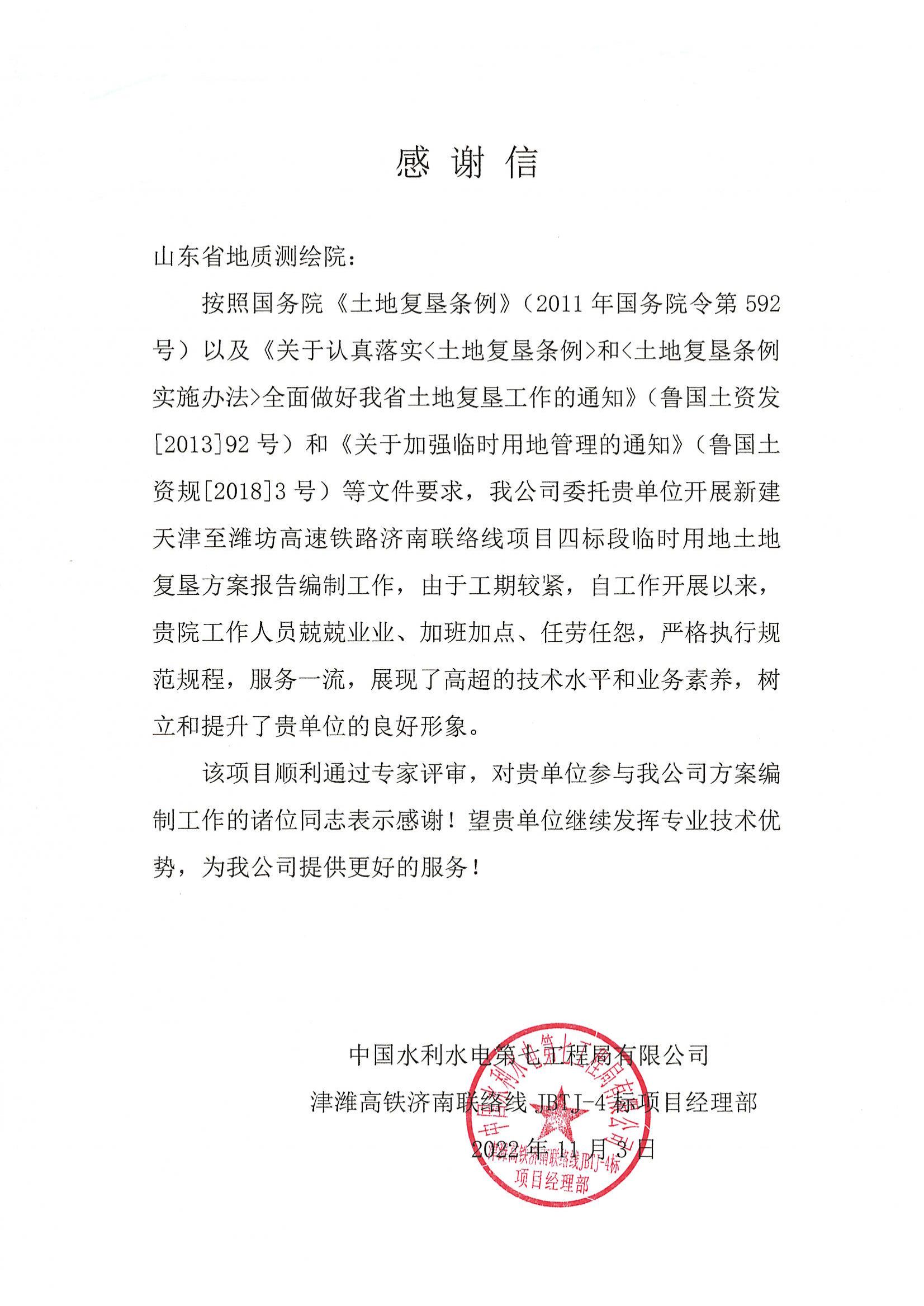 鲁网11月30日讯 近日,省地质测绘院承担的“新建天津至潍坊高速铁路济南联络线项目临时用地土地复垦方案报告书编制项目”顺利通过了滨州市自然资源和规划局组织的专家验收,收到了中国水利水电第七工程局有限公司发来的感谢信,对省地质测绘院编制完成的《新建天津至潍坊高速铁路济南联络线项目临时用地土地复垦方案报告书》给予高度评价,并向参与方案编制工作的工作人员表示衷心的感谢。