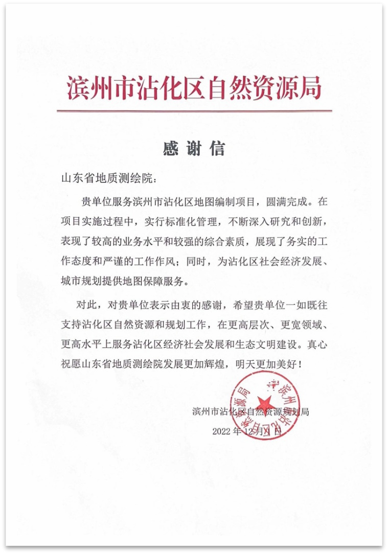 鲁网12月16日讯 近日,省地质测绘院收到滨州市沾化区自然资源局发来的感谢信,对全院在该区地图编制项目中给予的技术支持表示衷心感谢。