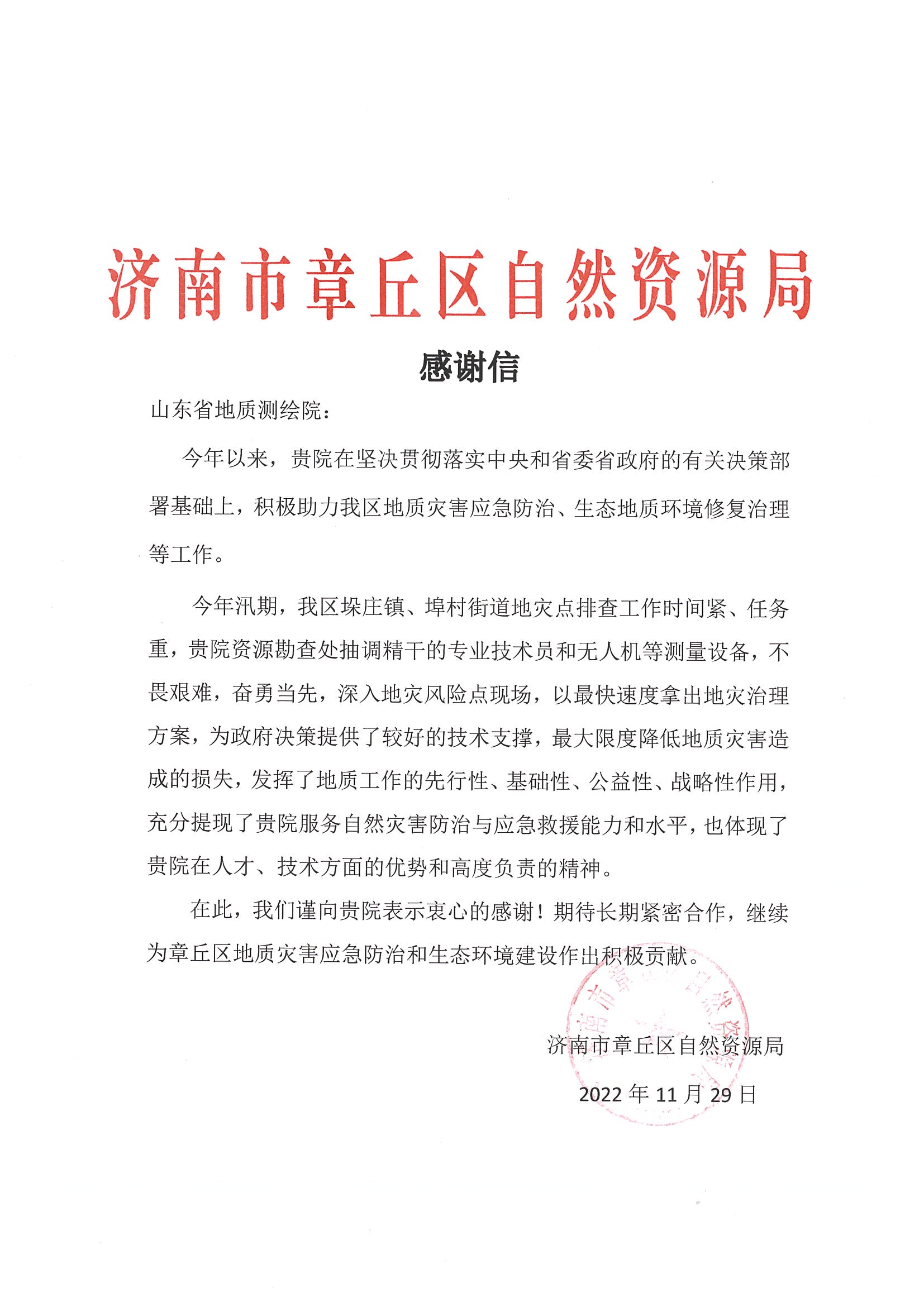 鲁网12月16日讯 近日,省地质测绘院收到济南市章丘区自然资源局感谢信,对全院在章丘区地质灾害应急防治及生态环境修复治理工作领域做出的贡献表示感谢。