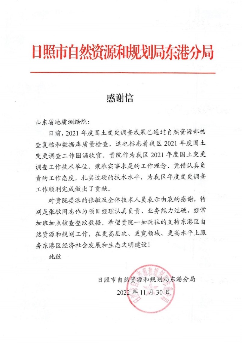 鲁网12月16日讯 近日,省地质测绘院收到日照市自然资源和规划局东港分局发来的感谢信,对全院在东港区2021年度国土变更调查工作中提供的技术支持表示衷心感谢,对技术人员的工作作风给予充分肯定。