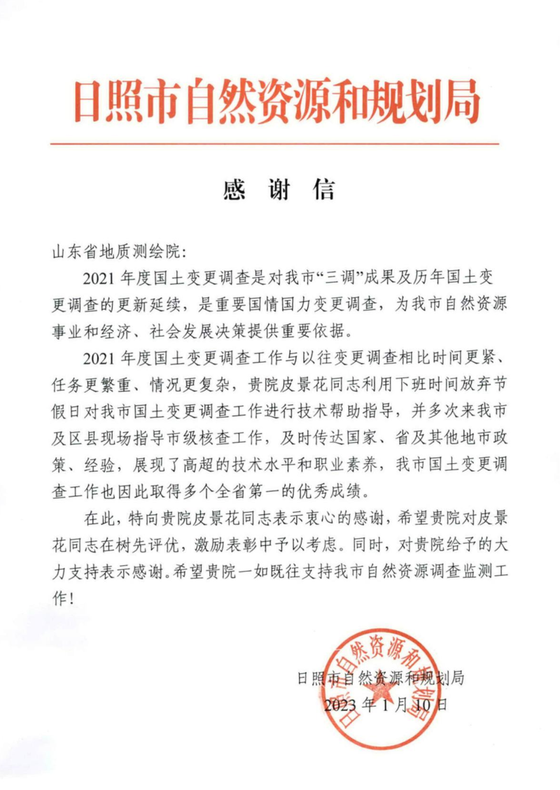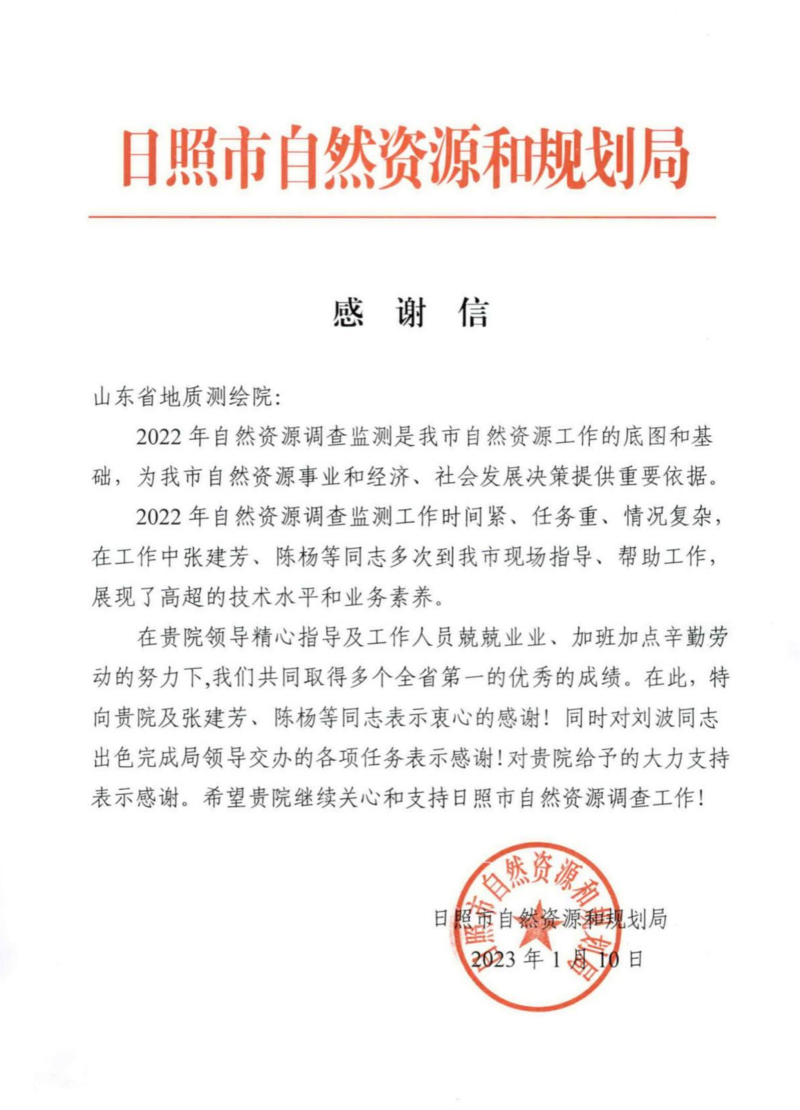 鲁网1月30日讯 近日,省地质测绘院收到两封日照市自然资源和规划局感谢信,对测绘院院在2022年自然资源调查监测和2021年度国土变更调查中给予的大力支持表示感谢。