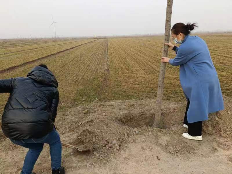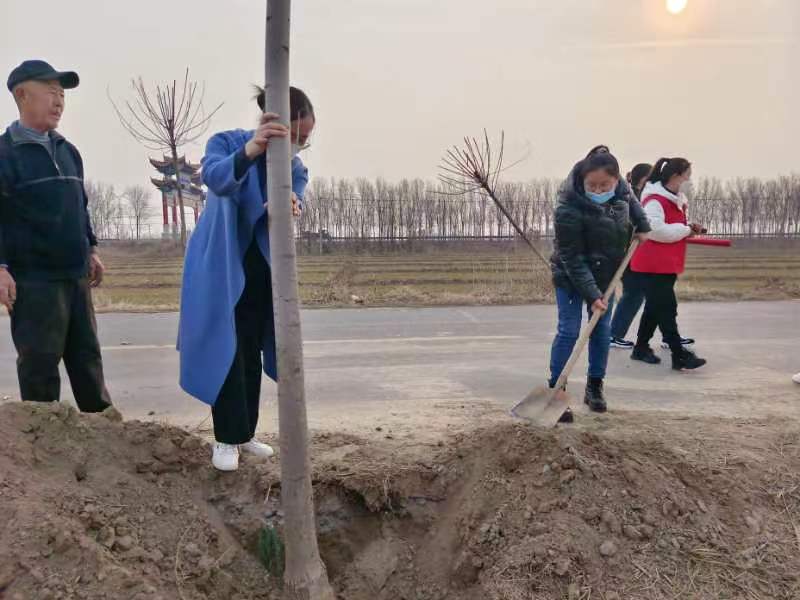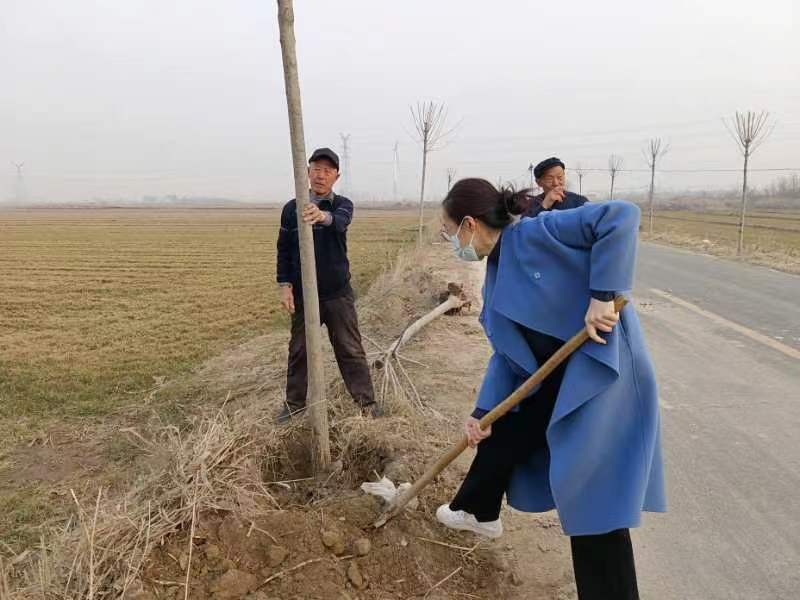 植树现场,政协委员们个个精神振奋,志气高昂。大家分工合作,认真做好每一道工序,呈现出一派热闹忙碌的劳动景象。植树现场,在李春霞的带领下,参加植树活动政协委员个个热情高涨、干劲十足,大家两人一组、三人一群,挥铁锨、挖树坑、扶树苗,分工协作、配合默契,悉心栽下一株株树苗,播下一片片新绿。经过一上午的辛勤劳作,共栽植白蜡、国槐等300余株,一排排小树整齐排列路旁,为美丽乡村增添了一片生机勃勃的底色。