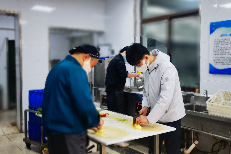 上午九时,青年志愿者们齐聚食堂,在工作人员的指引下进行了简单的分工。大家默契配合,有技出技、有力出力,一组择菜、切菜准备食材,一组洗碗、擦拭桌椅、摆放餐具,一组拌馅、擀皮、包包子,全身心投入到帮厨工作中,不亦乐乎。