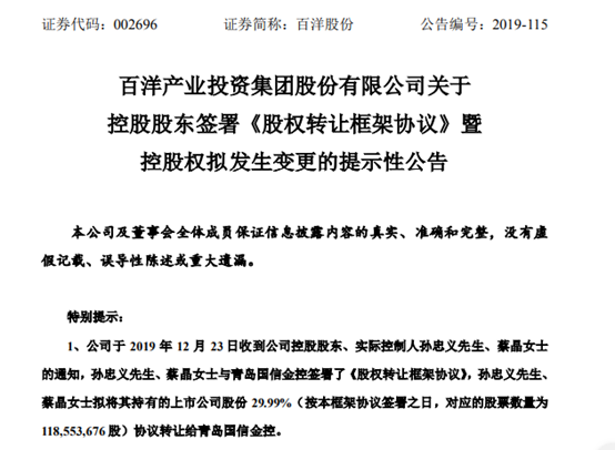 记者从深圳证券交易所了解到,日前,百洋产业投资集团股份有限公司(百洋股份.002696.SZ)的控股股东、实际控制人孙忠义、蔡晶与青岛国信金控签署了《股权转让框架协议》,孙忠义、蔡晶拟将其持有的上市公司股份 29.99%协议转让给青岛国信金控,如此次股权转让实施完毕,百洋股份的控股股东将变更为青岛国信金控。